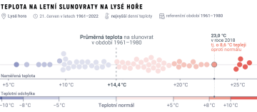 Mám jednu nedávnou k tématu teplotních extrémů. Celkem jednoduchá data – naměřené teploty na jednom místě ve stejný den posledních 30 let. Byť jsme zvolili poměrně snadný graf, není úplně nejznámější, a tak může chvíli čtenáři trvat, než se rozkouká.